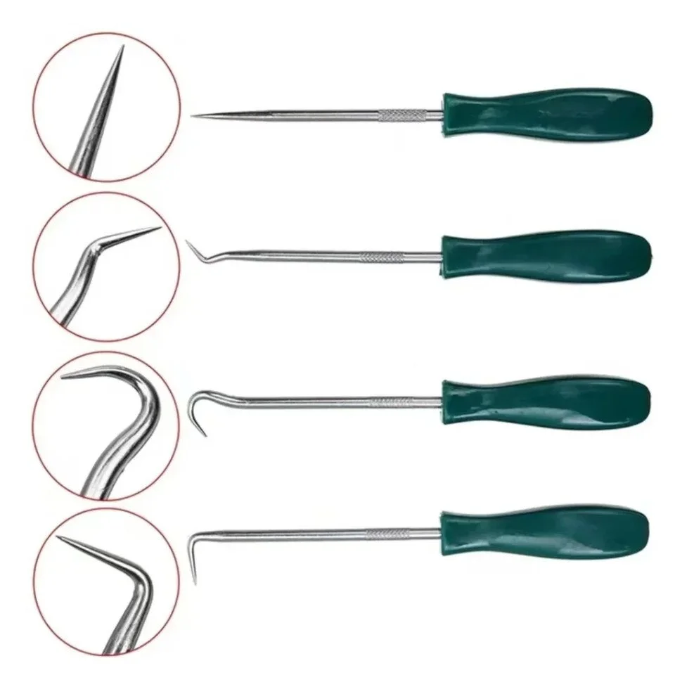 A must-have toolkit essential for bike mechanics, automotive work, and precision hobby jobs. This 4-piece pick and hook set provides the perfect combination of durability, control, and versatility—ideal for removing O-rings, seals, springs, clips, and accessing tight or awkward spaces during repairs and servicing.